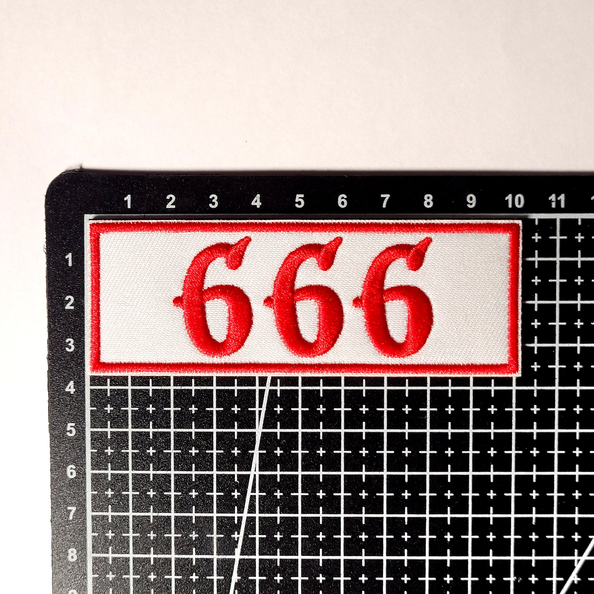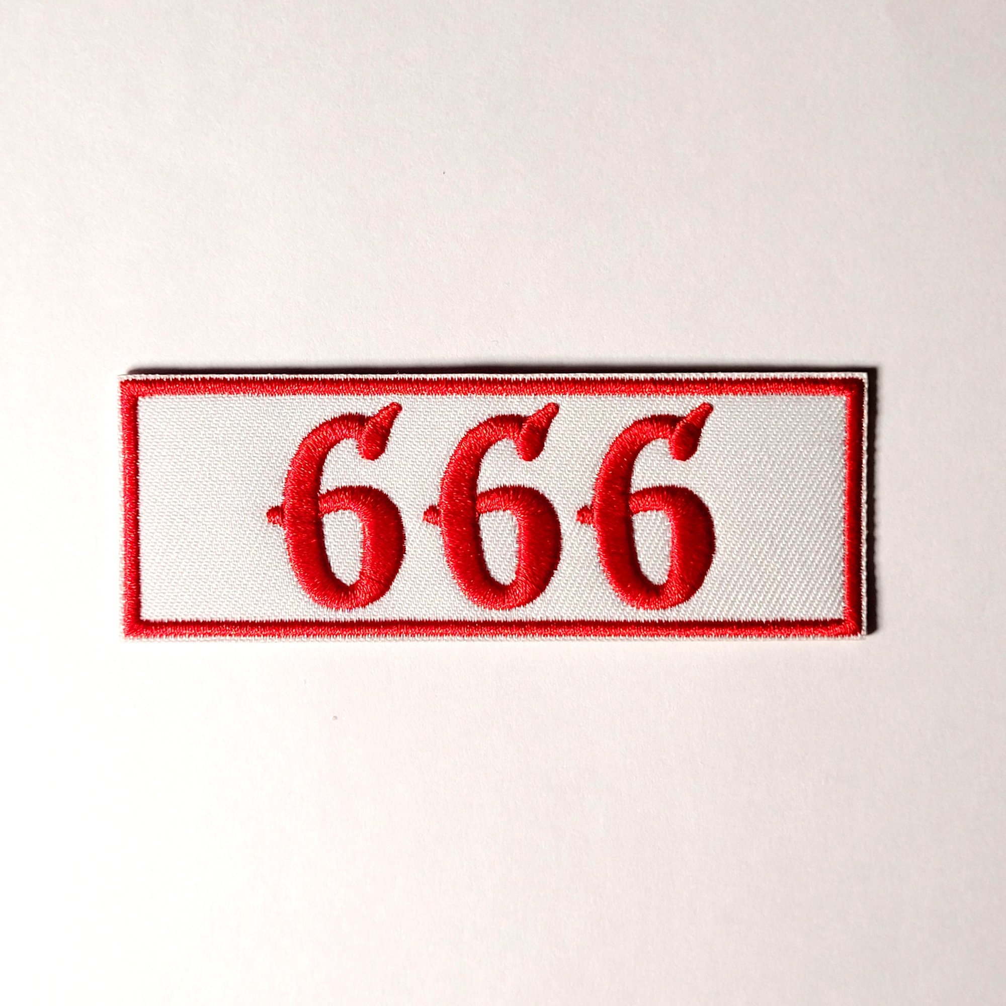 This satanic 666 embroidered patch has a merrowed edge and measures 10cm x 4cm which is approximately 4" x 1" & 1/2 inches.