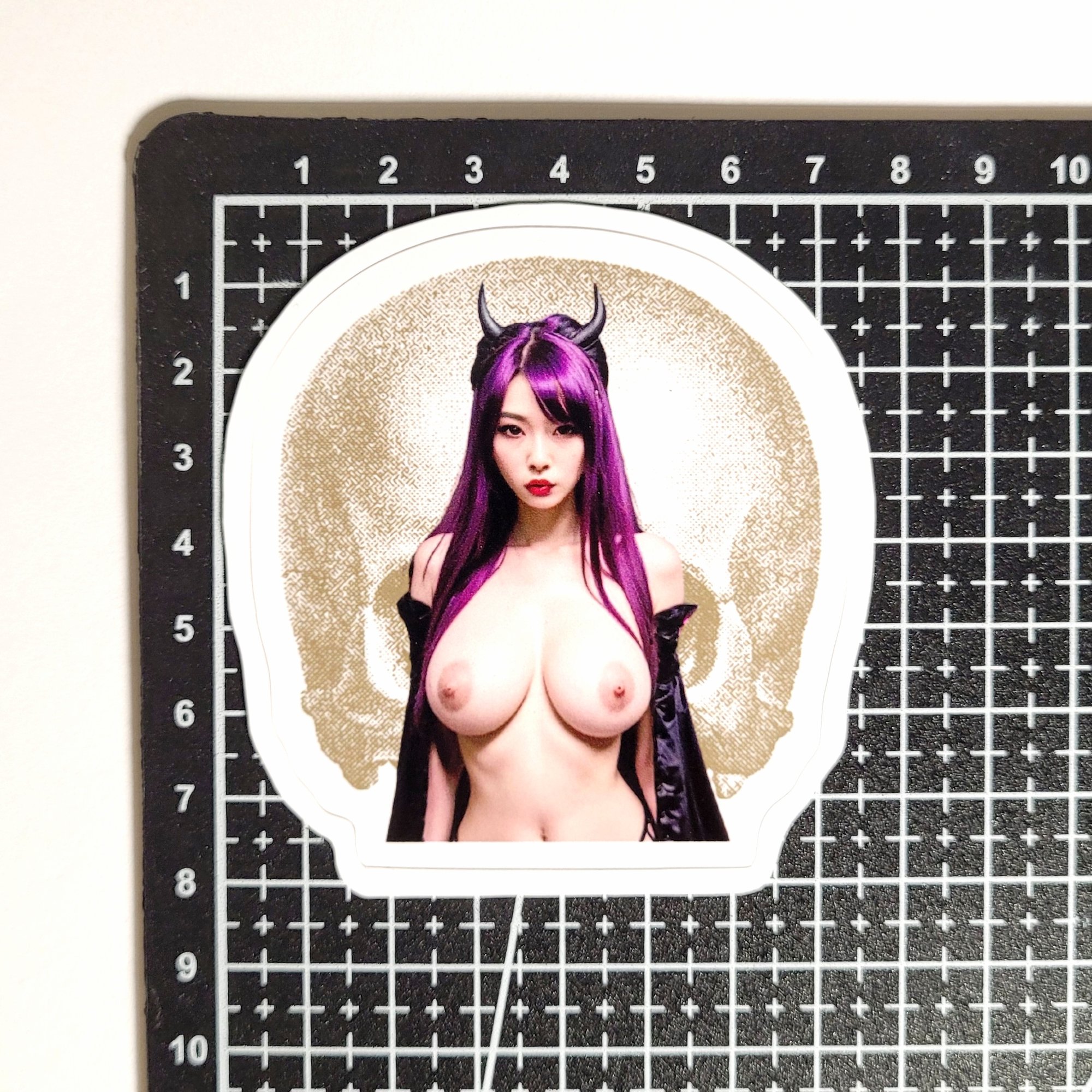 Beautiful Purple Haired Bare Breasted Succubus With A Skull Backdrop Glossy Finish Vinyl Sticker