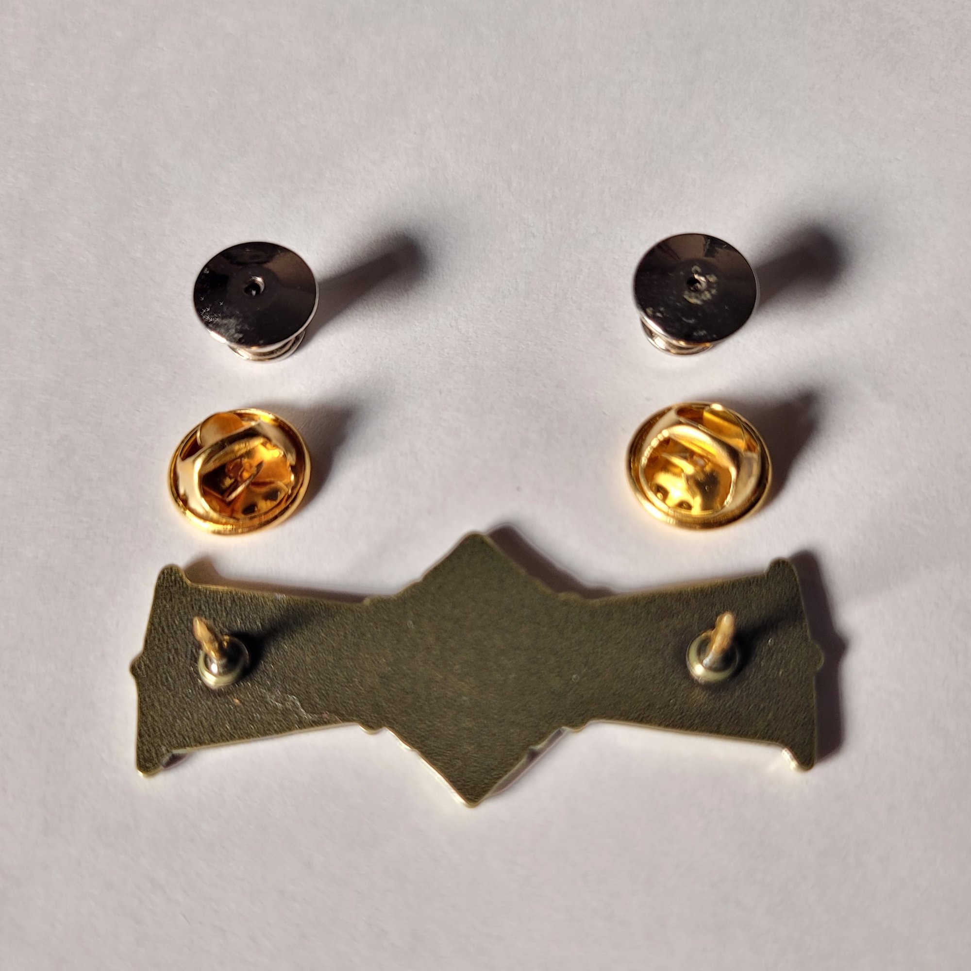 This Bolt Thrower Pin has double pin attachment mechanisms on the back of it to ensure that it stays on and stays on straight. The measurements of this pin are depicted in the photos of this listing. Each pin will come with the original back locking mechanisms that they came with, whether it be the metal pinch style or the black silicone style backing AS WELL as - I will be including easy to attach and unlock pin lock mechanisms with each enamel pin purchase to ensure that your pin never falls off and you never lose it, no matter how hard you're head banging or how rowdy the circle pit gets! See pics of it in listing.