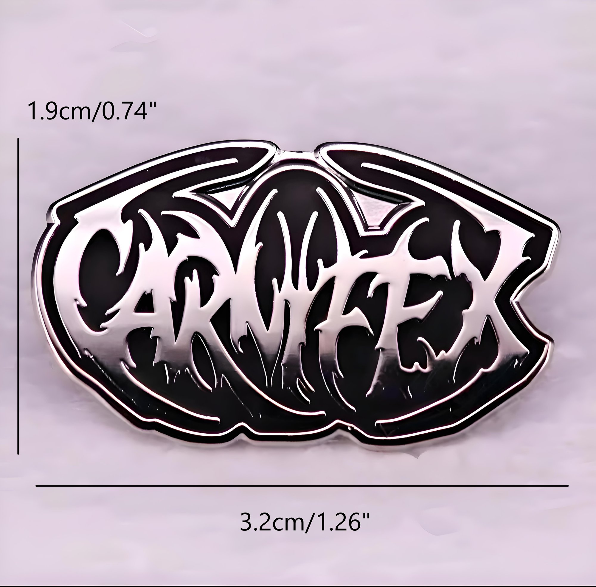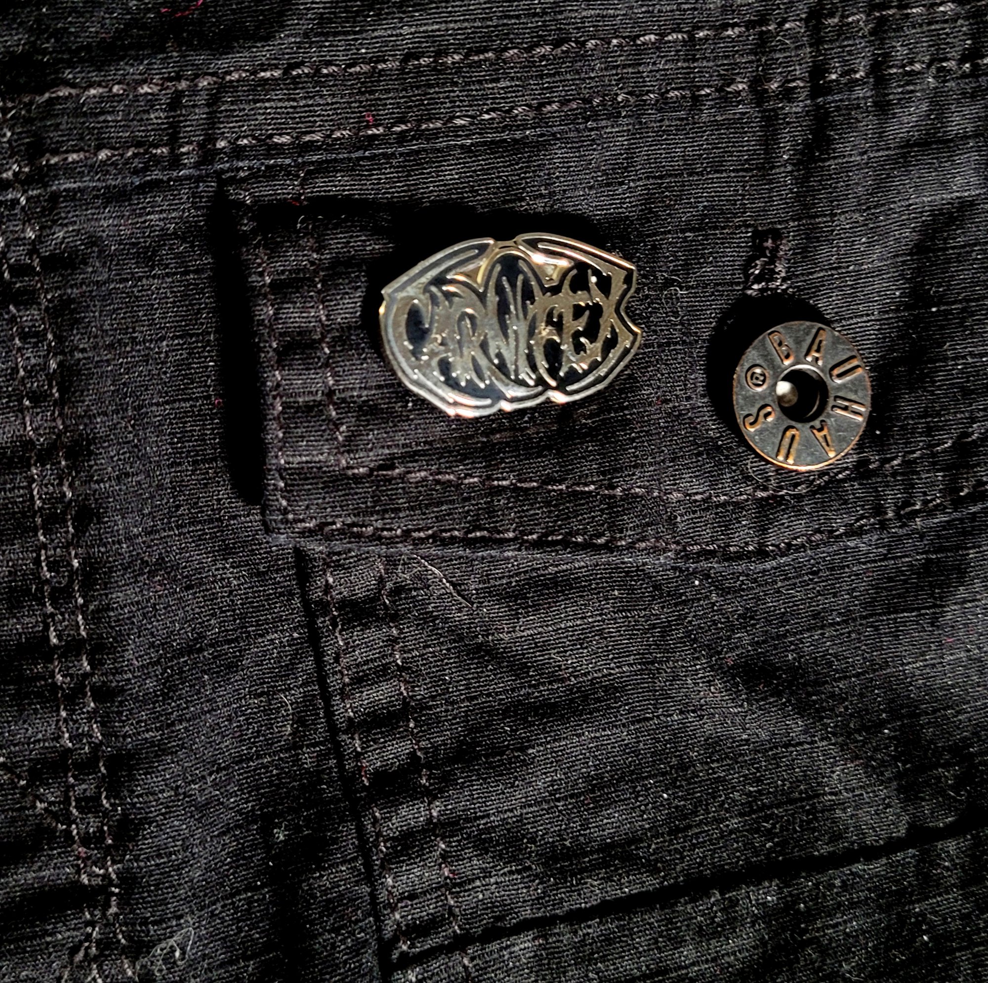 This Carnifex Band Logo enamel has a singular pin attachment mechanism on the back of it. The measurements of this pin are depicted in the photos of this listing. Each pin will come with the original back locking mechanisms that they came with, whether it be the metal pinch style or the black silicone style backing AS WELL as - I will be including easy to attach and unlock pin lock mechanisms with each enamel pin purchase to ensure that your pin never falls off and you never lose it, no matter how hard you're head banging or how rowdy the circle pit gets! See pics of it in listing.