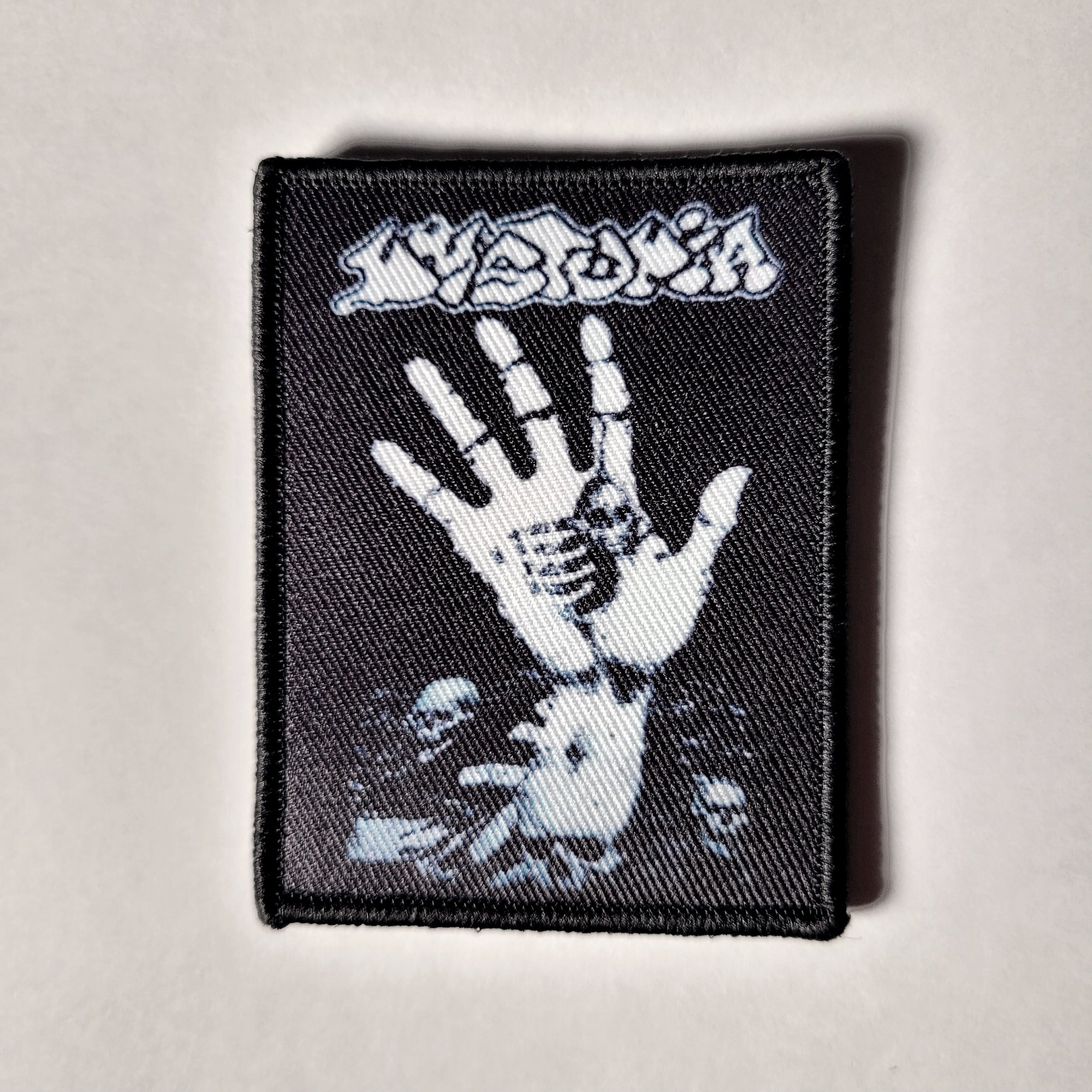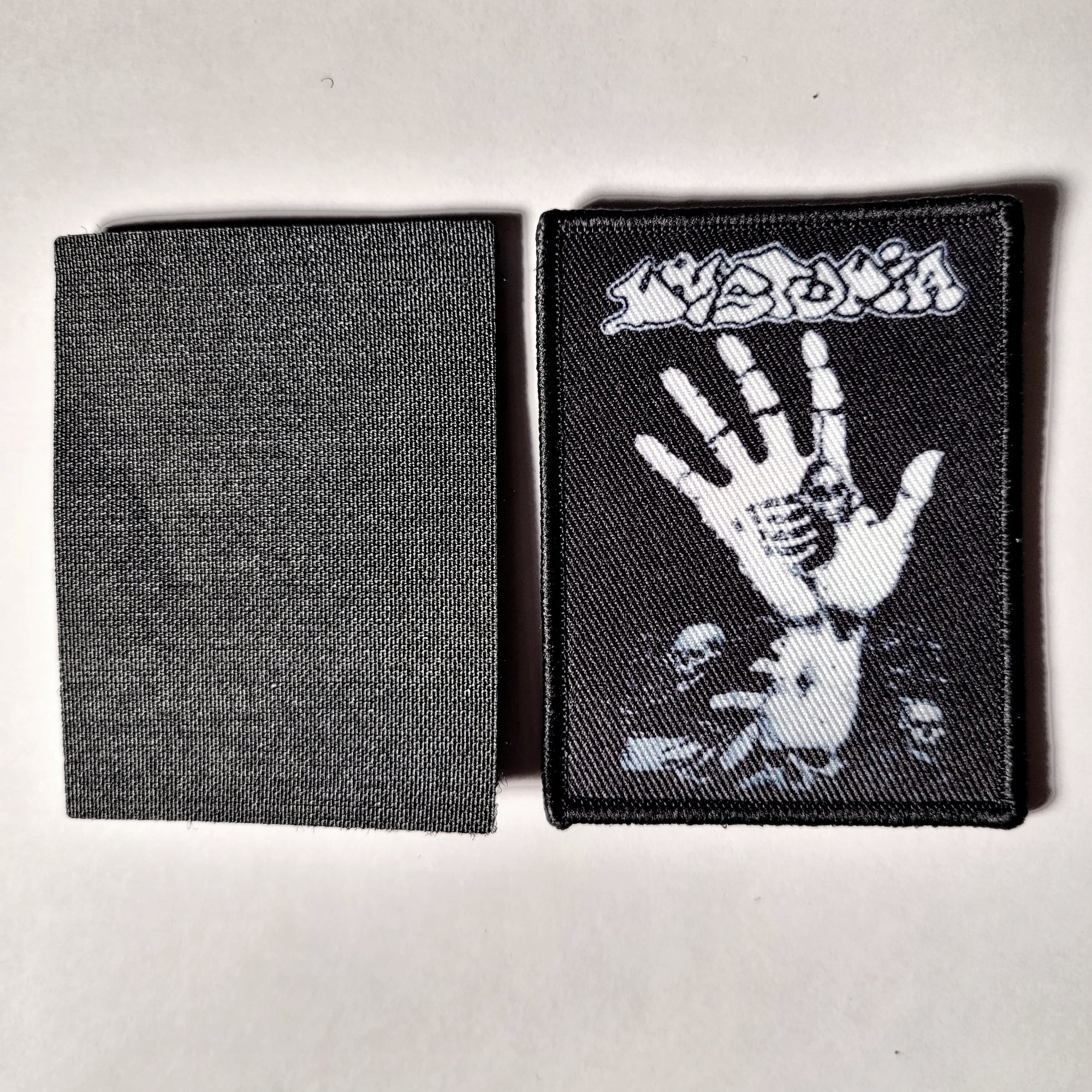 This Dystopia patch has the graphic printed on it and has a merrowed edge to it as well. Itcomes in two pieces as it's a velcro (loop & hook) attachment patch with removal capability. You sew "loop" portion of the patch onto your clothing and then the patch with the "hook" backing iattaches itself to it. The patch measures 8.5cm x 6.5cm which is approximately 3" & 3/8 x 2" & 1/2 inches.