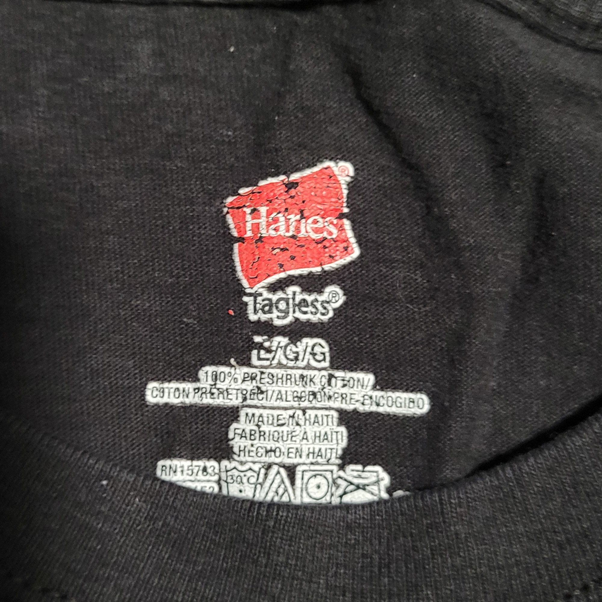 This is a previously worn used shirt. It's slightly faded and the vinyl graphic is slightly faded and cracked (see pics). It is a size LARGE.