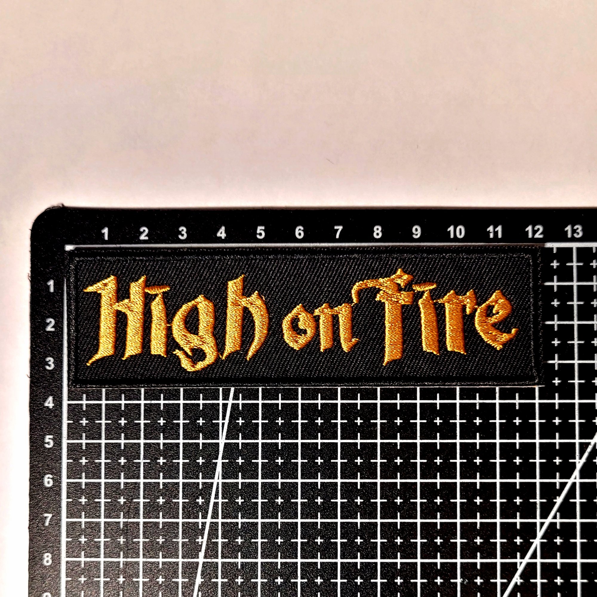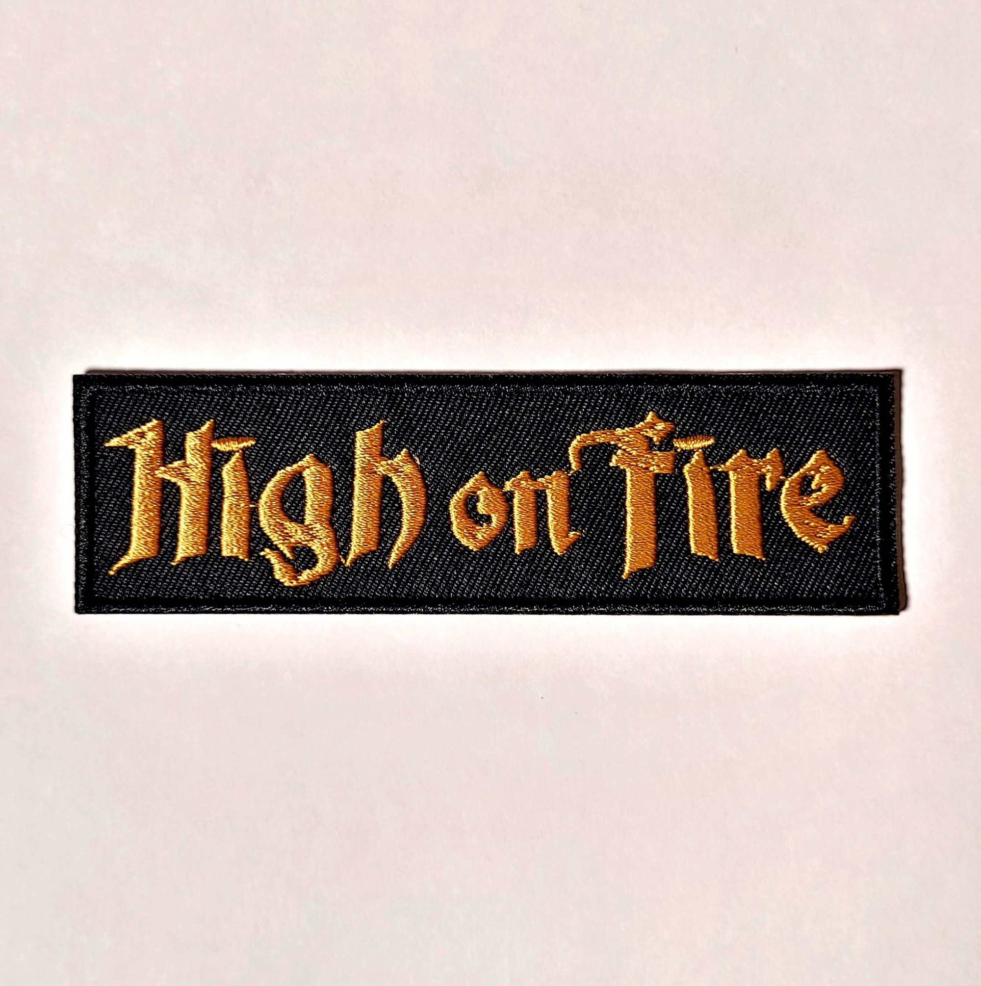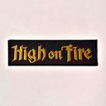 This High On Fire embroidered patch has a merrowed edge and measures 12.5cm x 3.5cm which is approximately 5" x 1" & 3/8 inches.