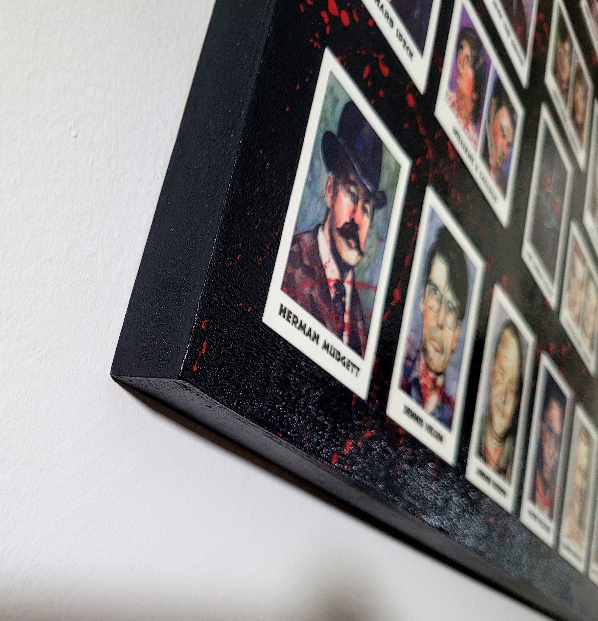 I made this Serial killer poster board out of a 24" x 18" x 1" piece of Birchwood art board and using Series One True Crime Trading Cards. I painted the board black, blood spattered it with red paint, adhered the cards to the board, and clear coated the entire board with a Krylon clear coat spray. For this board in particular, I tried to pick out and use cards of some of the more infamous and notorious serial killers when making the boards. It makes for a great wall piece and conversation starter. I have a smaller one posted on here for a little cheaper. These boards are for local pick up purchases ONLY! I will NOT be shipping these boards so please don't follow through with the shipping process for this board. Thanks.