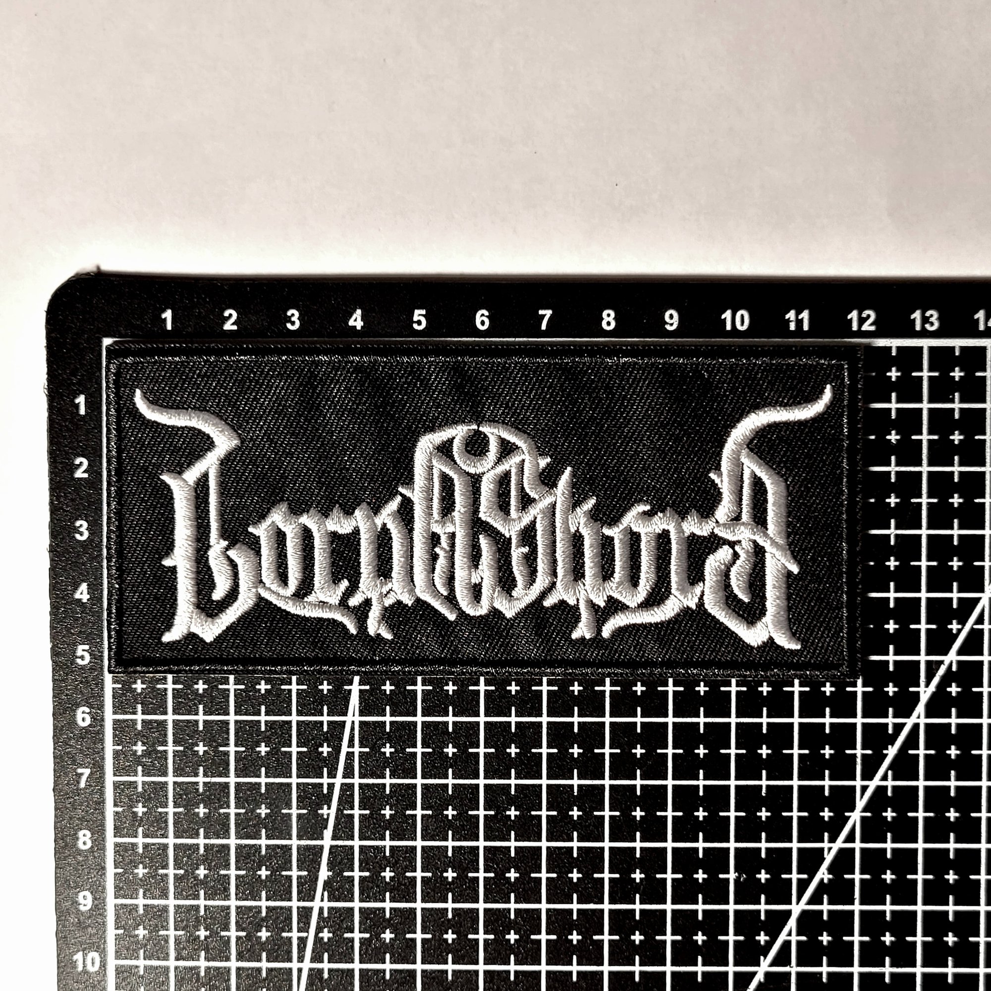This Lorna Shore black & white band logo embroidered patch has a merrowed edge and measures 12cm x 5.5cm which is approximately 4" & 3/4 x 2" & 1/8 inches.