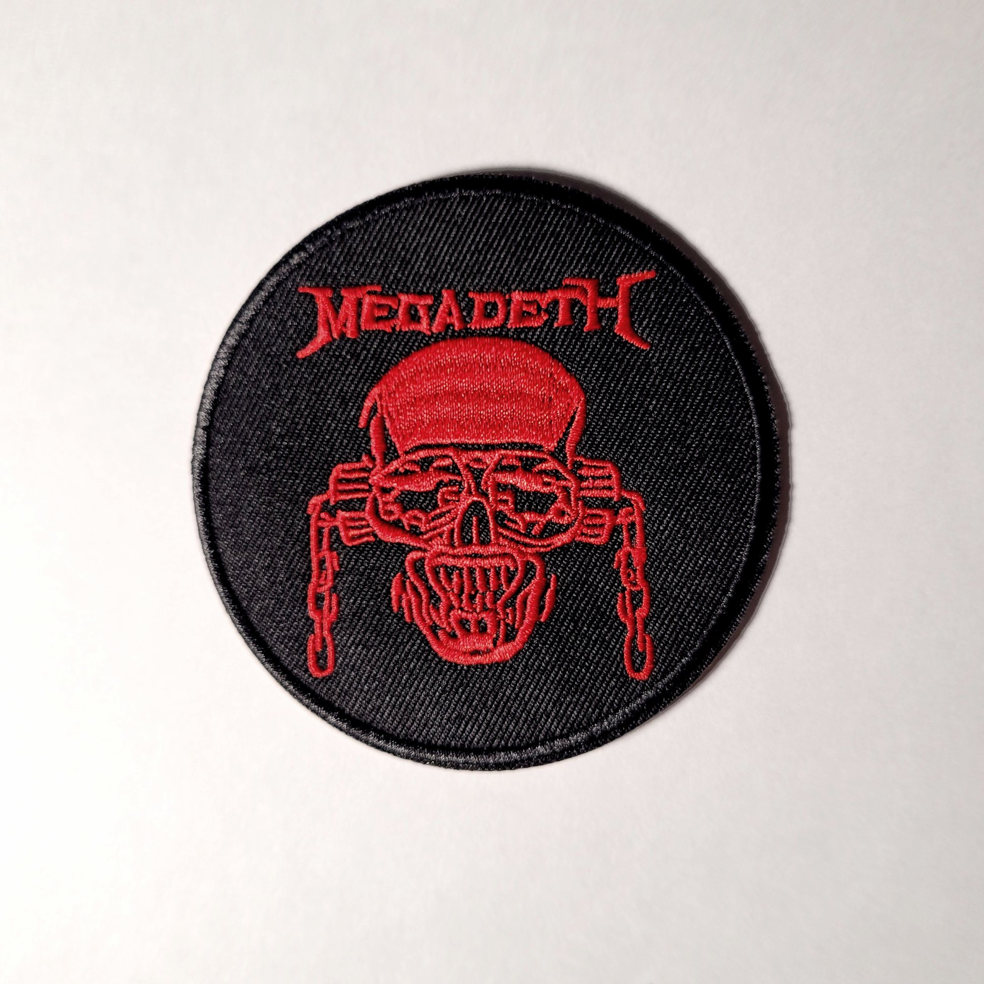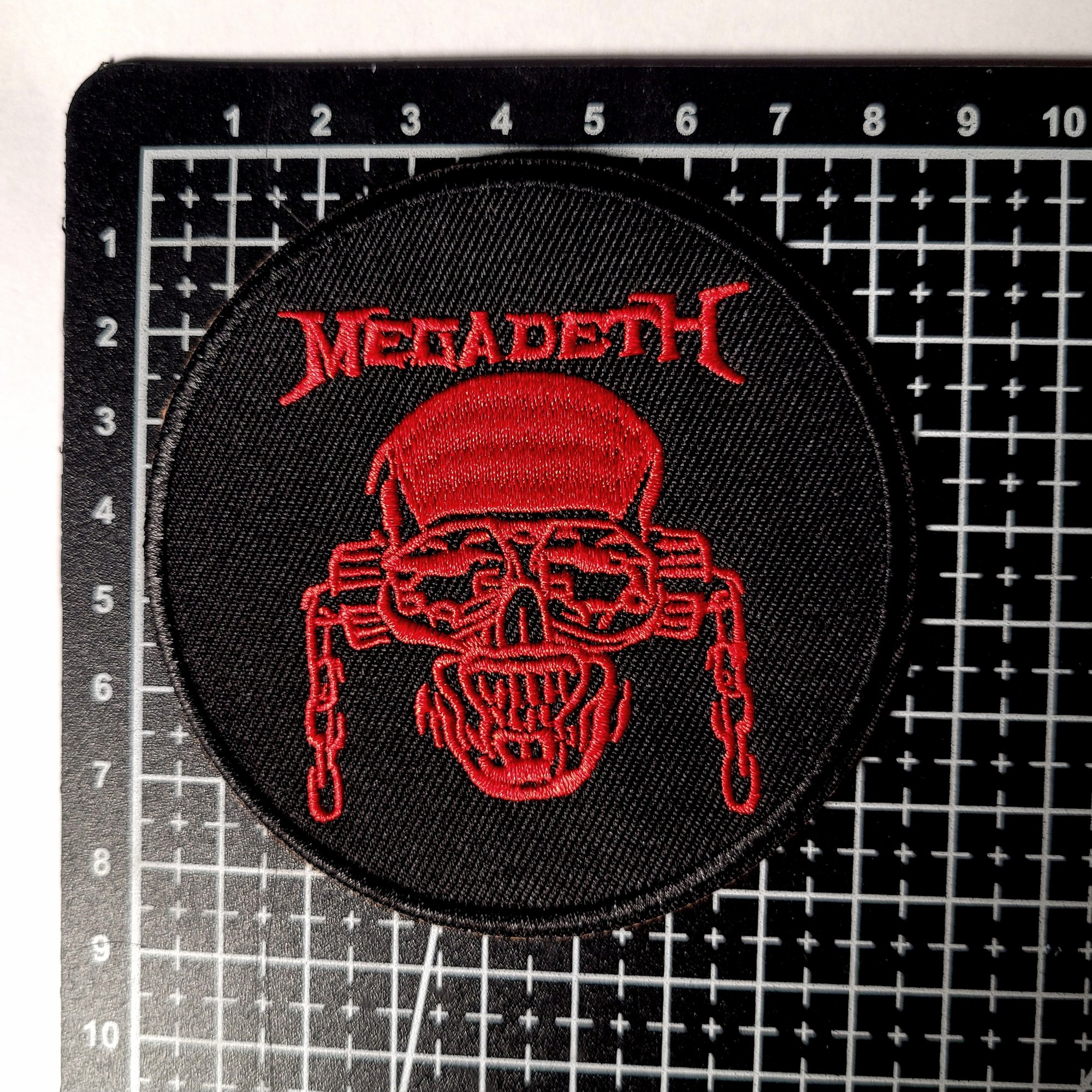 This Megadeth Vic Rattlehead embroidered patch has a merrowed edge and measures 8.5cm x 8.5cm which is approximately 3" & 3/8 x 3" & 3/8 inches.