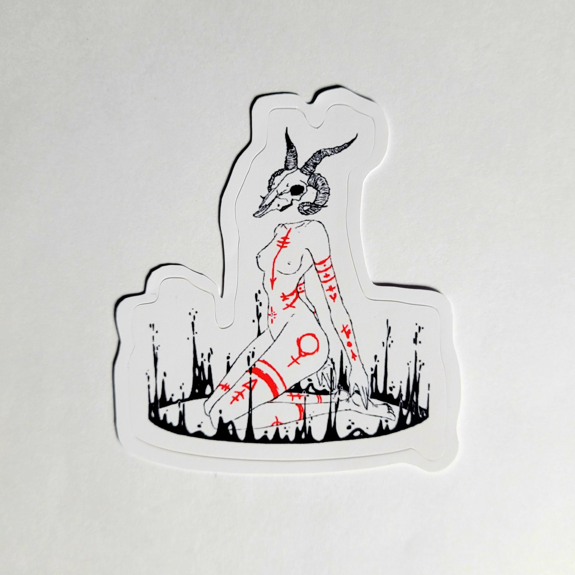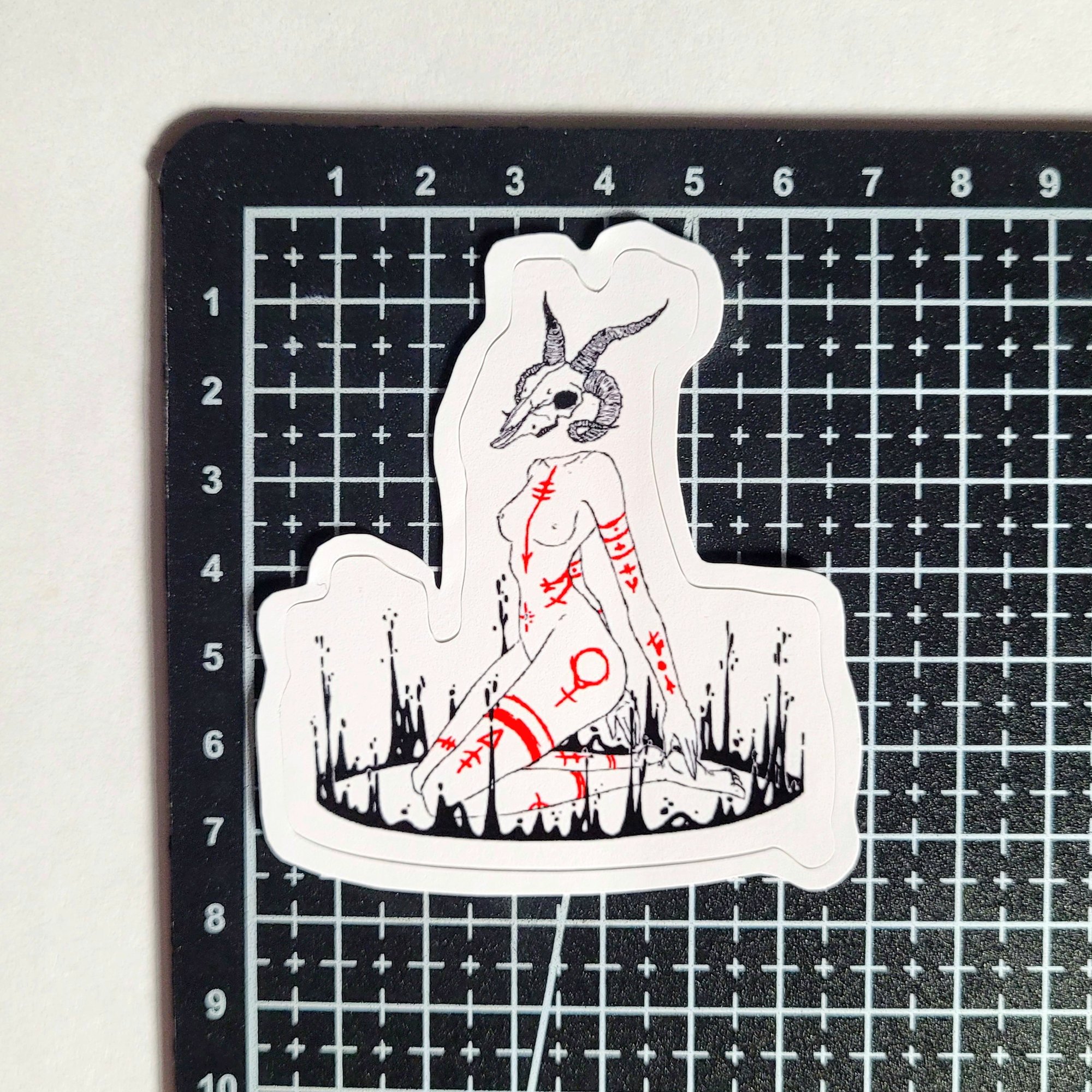 Naked Woman Wearing A Goat's Skull Performing A Satanic Ritual Matte Vinyl Sticker