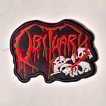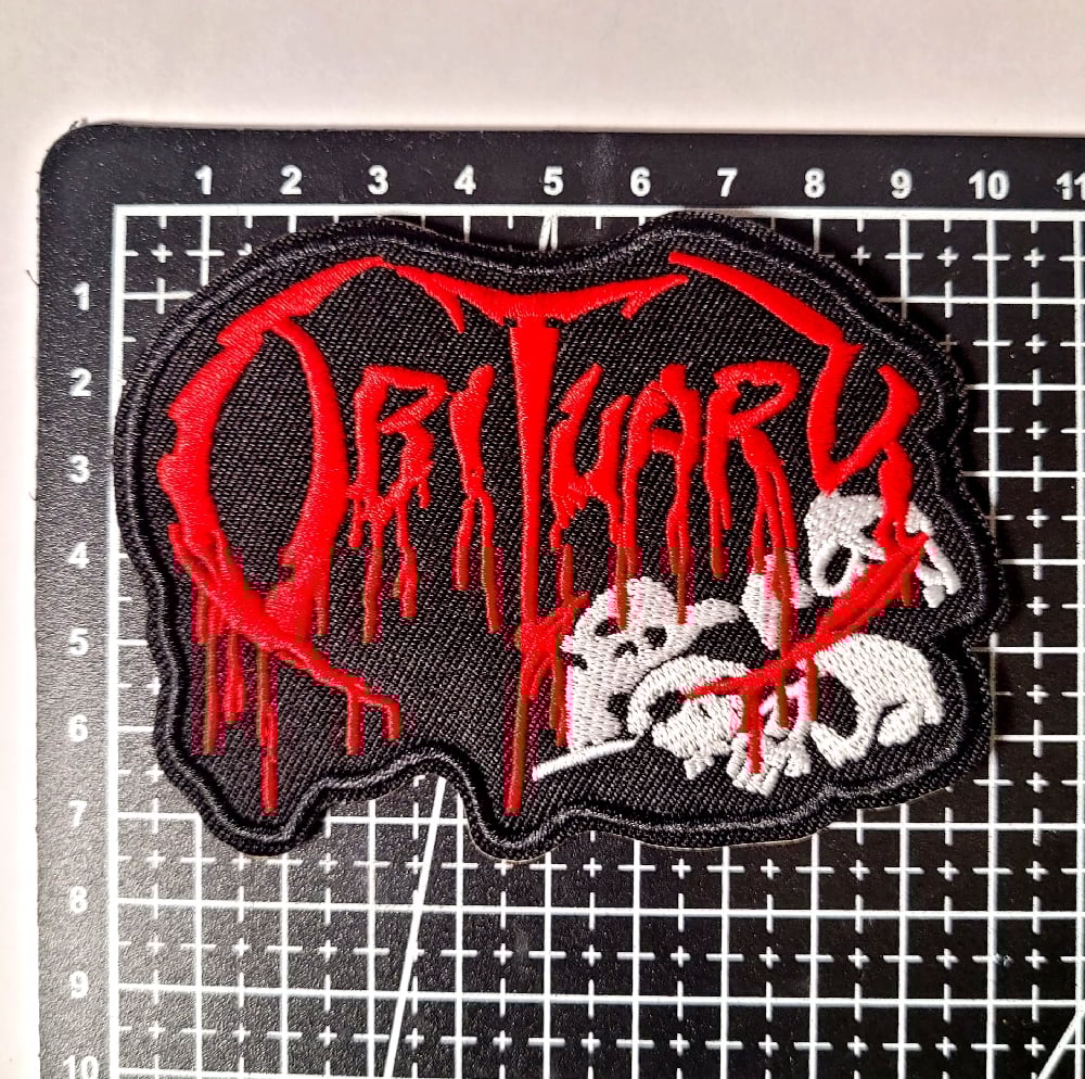 This Obituary Band Logo & Skulls embroidered patch has a merrowed edge and measure 10cm X 7.5cm which is approximately 4" X 3" inches.
