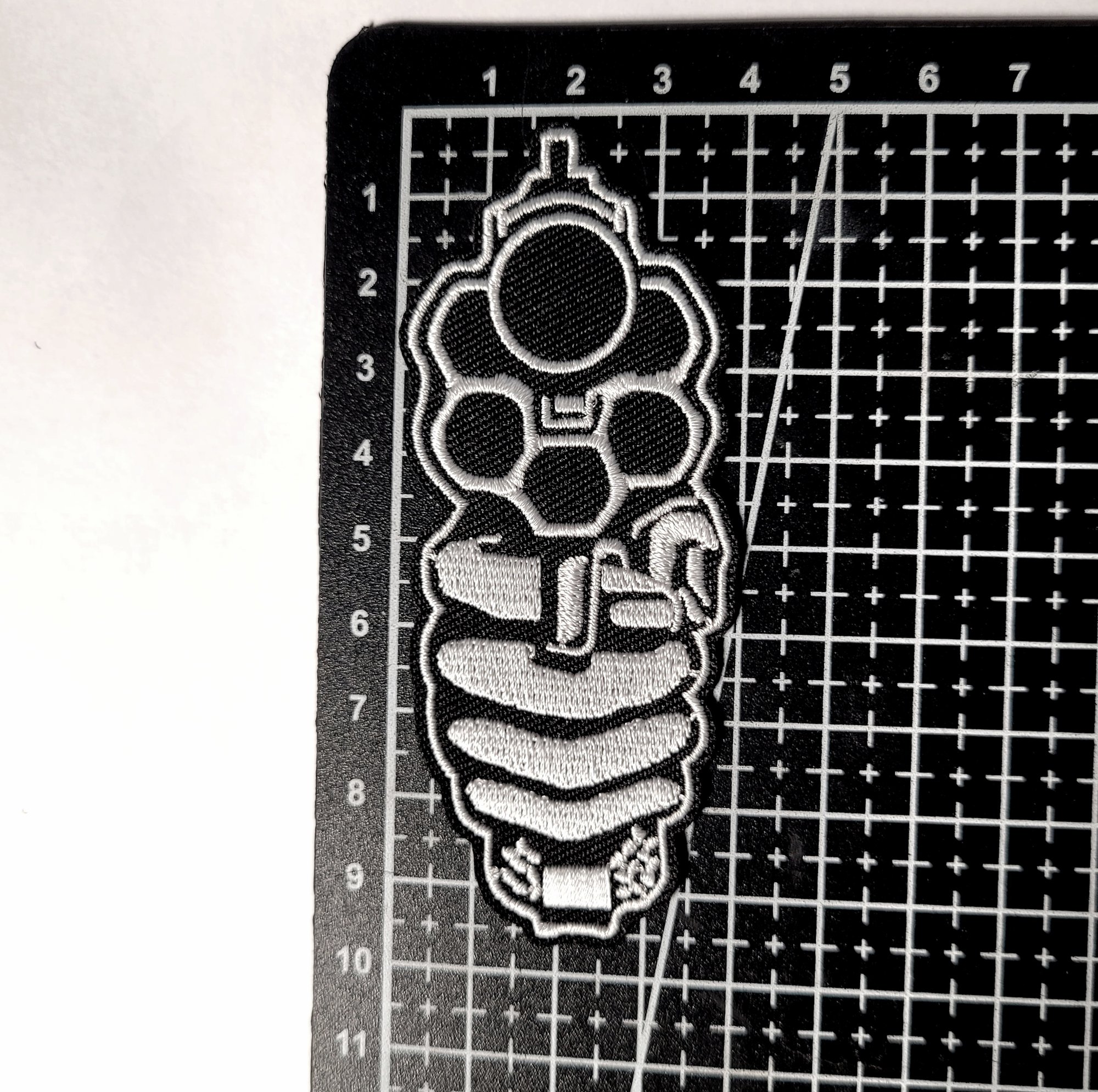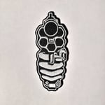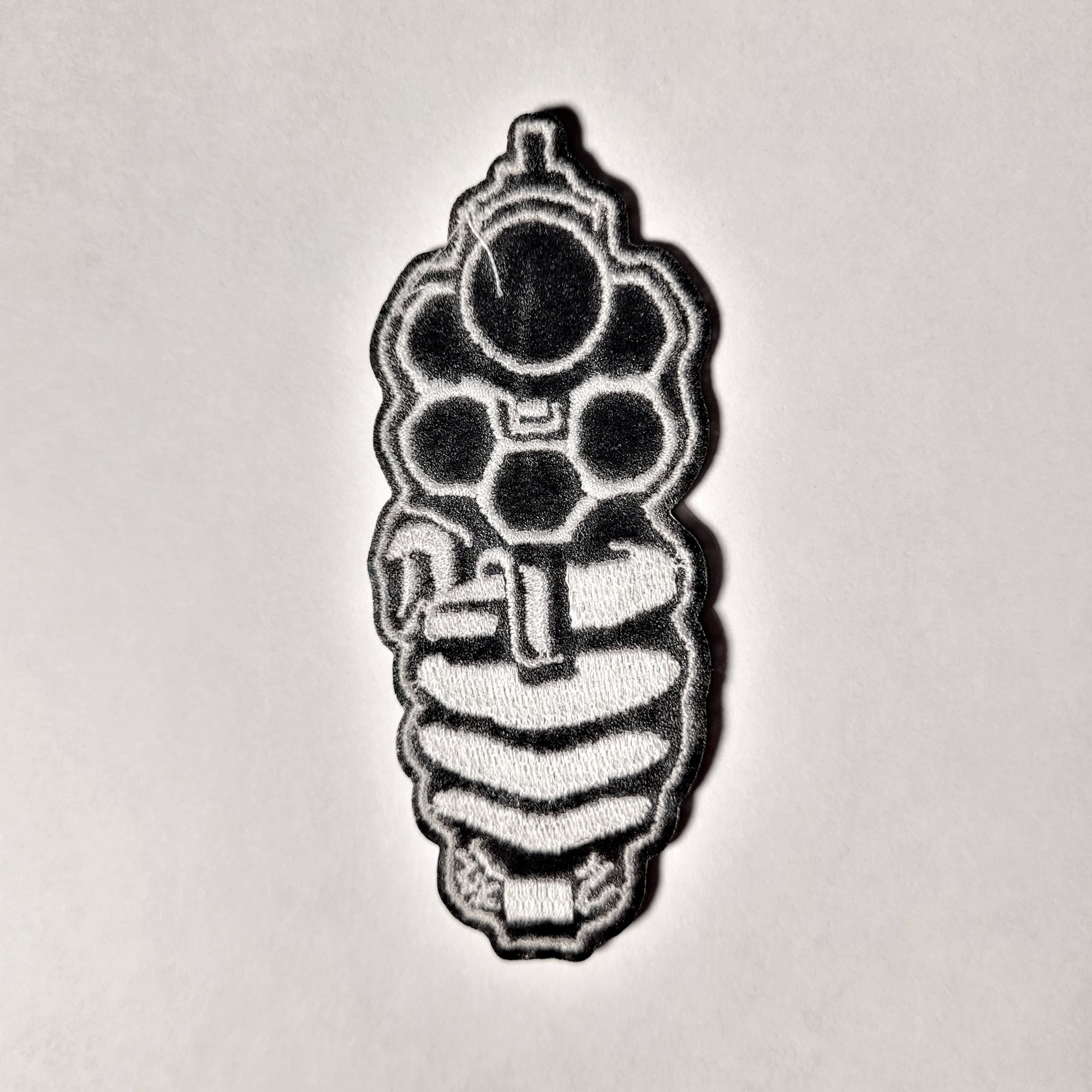 This embroidered Revolver Pistol Pointed At You patch has a merrowed edge and measures 9.5cm x 4cm which is approximately 3" & 3/4 x 1" & 1/2 inches.