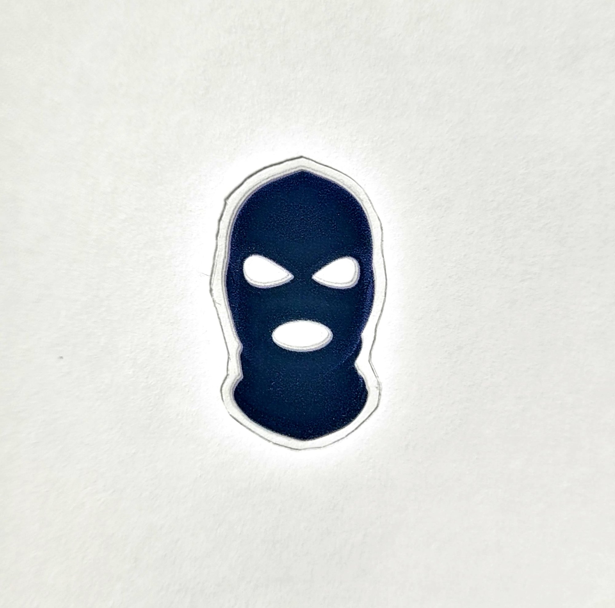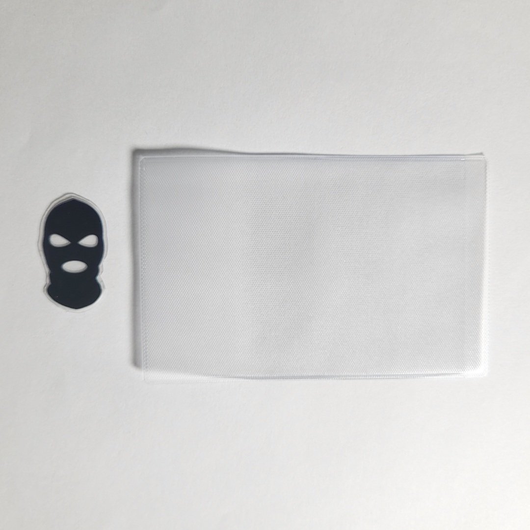 What comes with this purchase is a plastic sleeve for your driver's license or any other photo ID and a thick vinyl ski mask cut out sticker to place on top in position over your face. It's a fun novelty item to carry your license or ID around in.