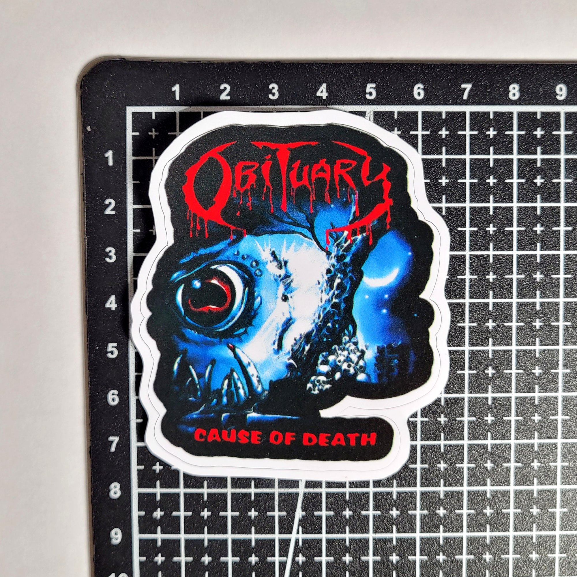 Sticker measures 7cm x 6cm which is approximately 2 & 3/4" x 2 & 3/8". This is the SMALL version of this sticker. I have the LARGE version of this exact sticker in stock if you keep looking in the "Death Metal" category or search "Obituary", it should come up.