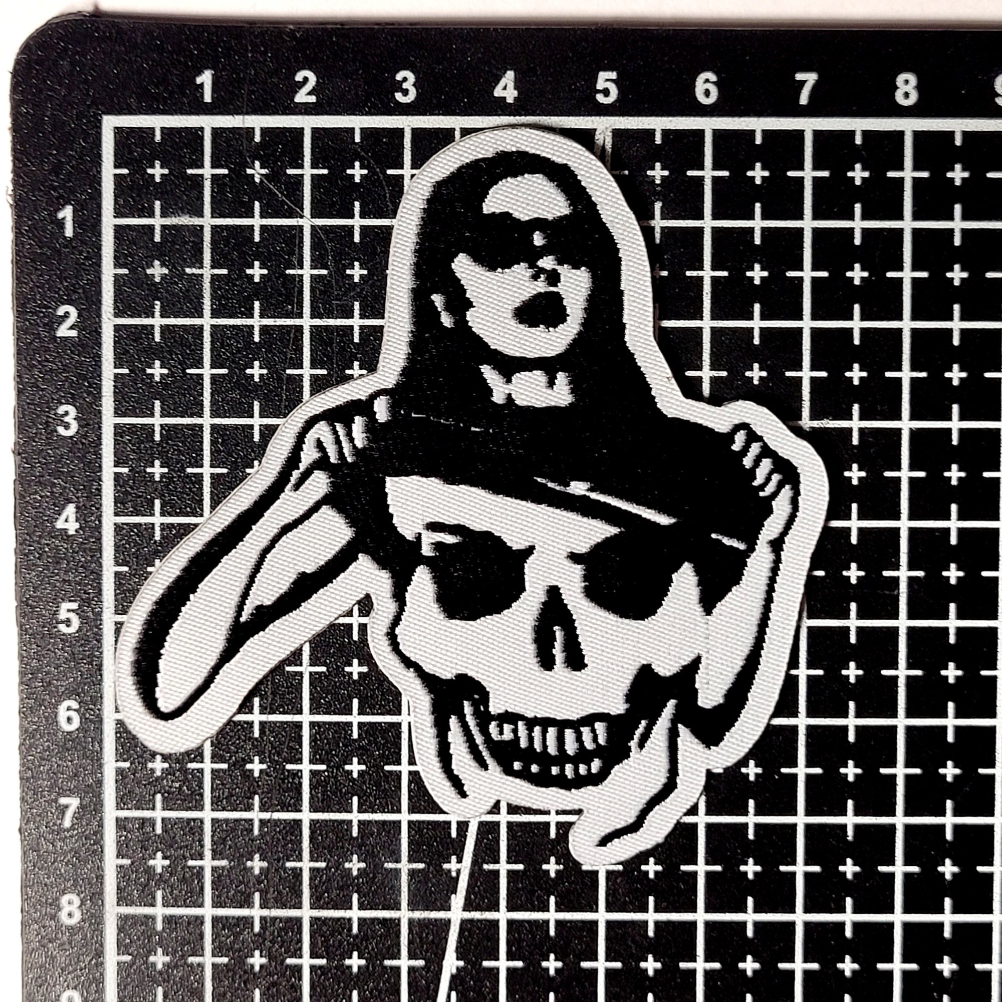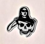 This embroidered Woman Flashing Her Skull Chest patch does NOT have a merrowed edge and measures in at 7.5cm x 7.5cm which is approximately 3" x 3" inches. It has an adhesive backing at which you peel the paper off and stick it in place wherever you plan on sewing it on. It MUST still be sewn on because the adhesive is not strong enough for a permanent hold.